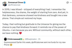 “In 2019, I was kitoed – stripped of everything I had. I remember the helplessness, the shame, the weight of starting from zero. And yet, in that darkness, someone showed me kindness and bought me a new phone,” he wrote.