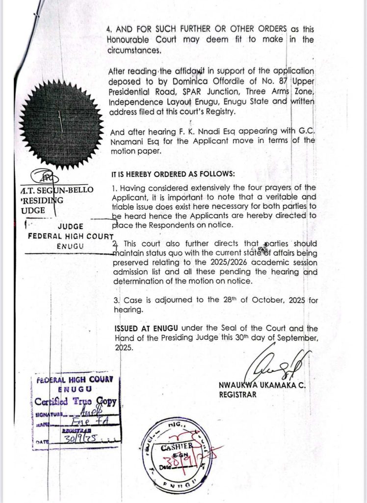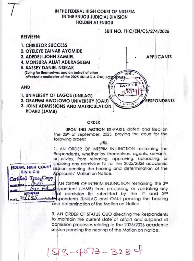 A Federal High Court sitting in Enugu has ordered the immediate suspension of the 2025/2026 admission process at the University of Lagos (UNILAG) and Obafemi Awolowo University (OAU).
