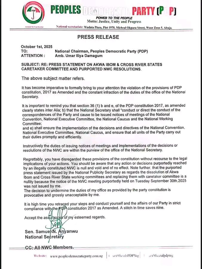 The letter is the latest in the crisis rocking the opposition party, which has been deepening in recent weeks. Last week, both Damagum and Anyanwu sent conflicting letters to the Independent National Electoral Commission (INEC) regarding the conduct of the Cross River State congress.