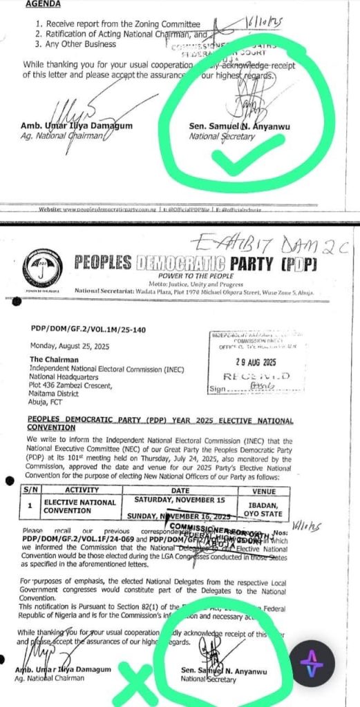 The crisis rocking the Peoples Democratic Party (PDP) has taken a dramatic turn following the discovery of a forged signature of the party’s National Secretary, Senator Samuel Anyanwu, on a convention notice reportedly submitted to the Independent National Electoral Commission (INEC) by the Umar Damagum-led faction of the party.