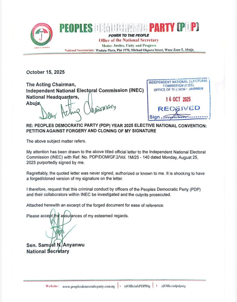 “My attention has been drawn to the above titled official letter to the Independent National Electoral Commission (INEC) with Ref. No. PDP/DOM/GF.2/Vol. 1M/25 – 140 dated Monday, August 25, 2025 purportedly signed by me.”
